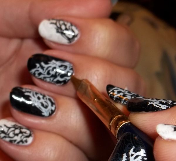 Here, I messed around a bit with Essie Candy Apple, All that Glitters Spottie Dottie Light and Dark, Dollish Polish Puttin on the Ritzzzzz, and Spoiled Shuffle the Deck (which is a horrible franking polish! so sparse!)